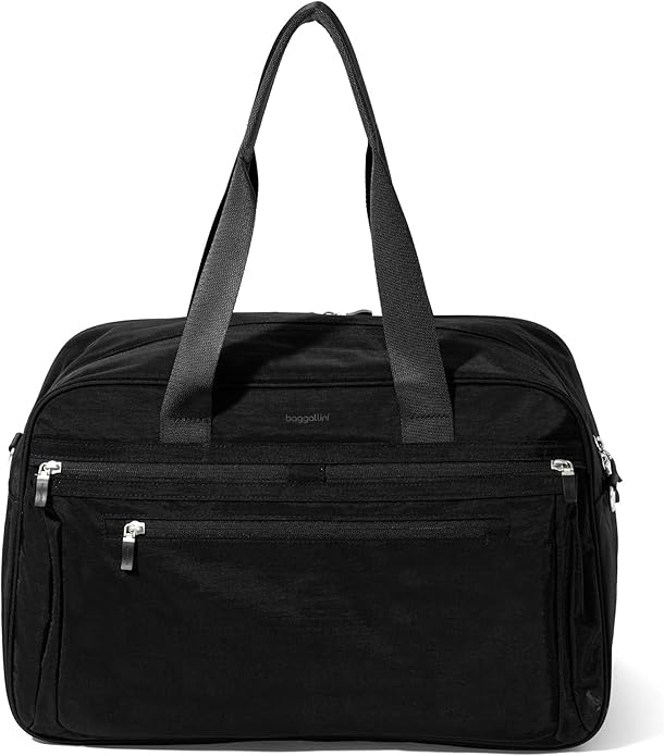 Baggallini Weekender Expandable Duffel – Lightweight 11×17 Inch Overnight Travel Bag is a winner for its size, luggage handle sleeve, AND – most important for me – the light colored interior. If you’ve ever opened a bag or purse that had a dark interior color, you know it can make it hard to find your things.
